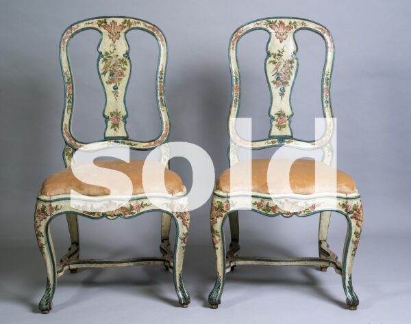Set of six Louis XV chairs with cartouche-shaped backs, Genoa, mid-18th century.