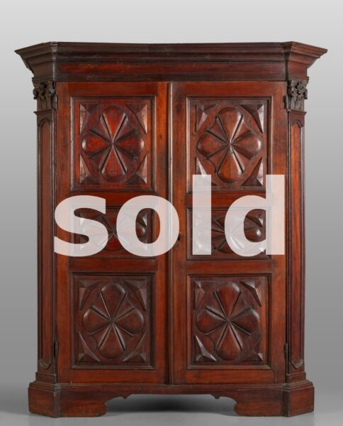 A Louis XIV walnut armoire with carved heart motifs on the panels and chamfered uprights, Genoa, 18th century.