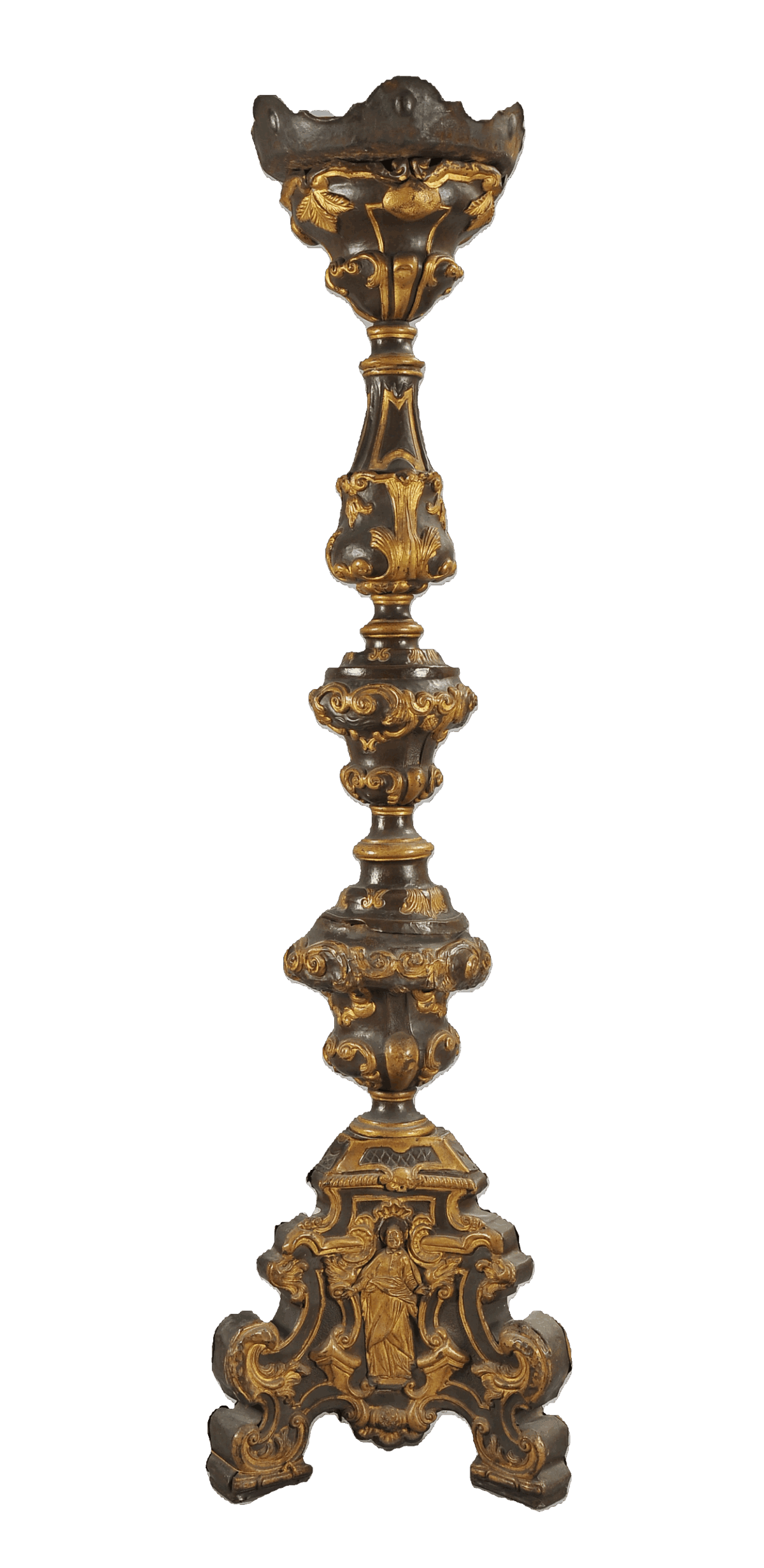 An important torchère from the Louis XIV period, crafted in richly repoussé, patinated and gilded copper. Rome, early 18th century