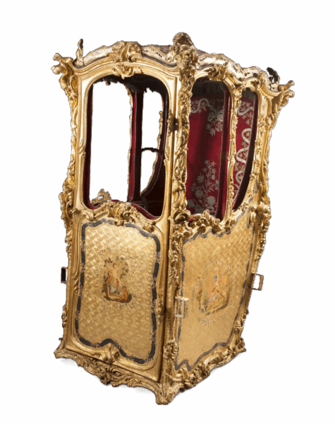 An Italian carved and giltwood and polychrome decorated sedan chair, with painted panels attributed to Giacinto Diano (1730 -1803), Naples, 18th century