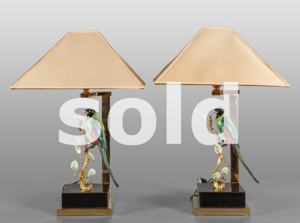 A pair of gilt bronze lamps with porcelain parakeets and polychrome leaves, Giulia Mangani, 20th century