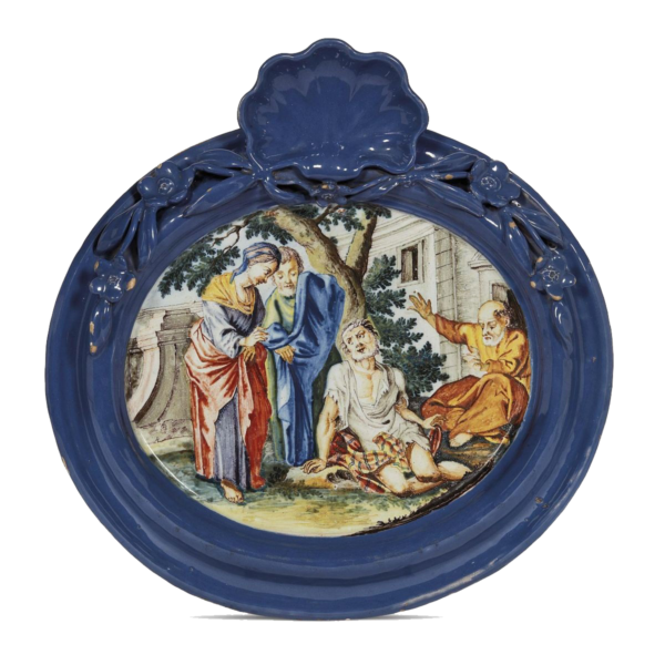 An oval polychrome maiolica plaque with frame, Savona, 18th century