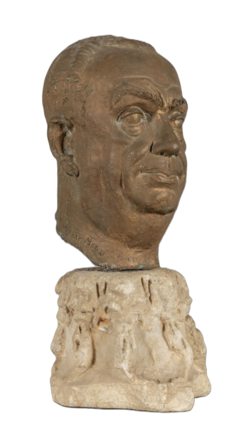 Male bronze head resting on an antique marble capital.