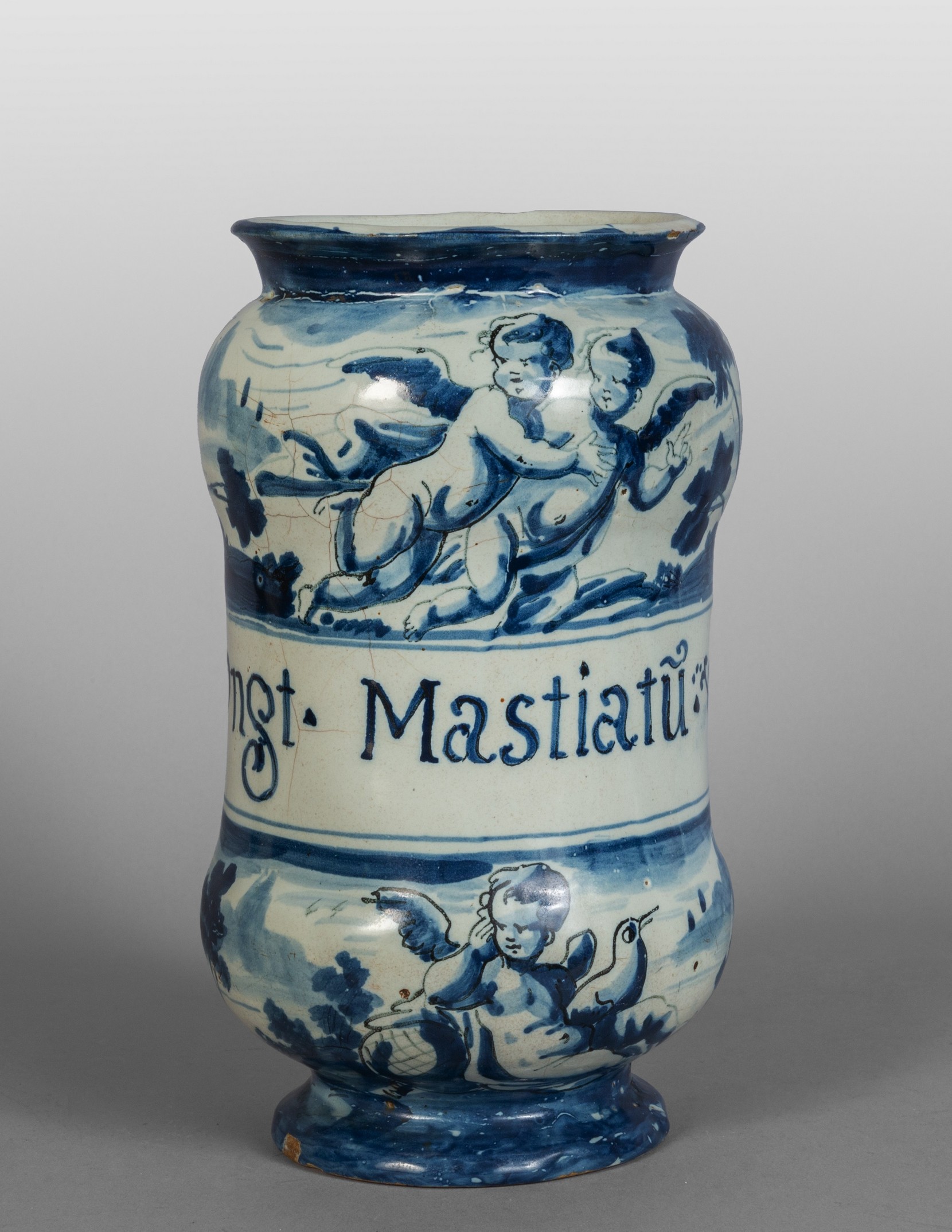 With medicinal inscription “Unguento Mastiatu”, marked on the base with the cross-in-circle and the initials L