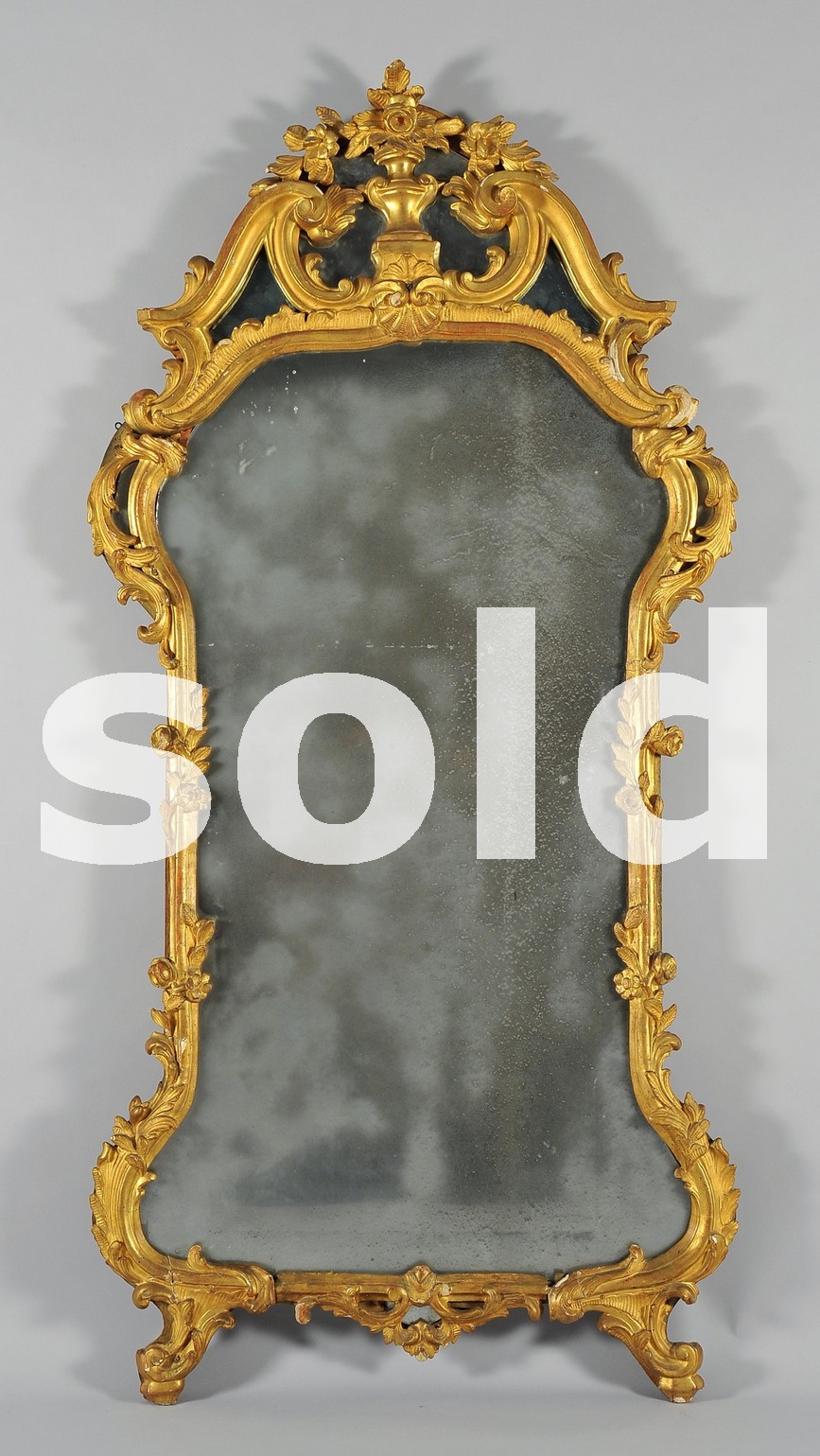A Genoese Barocchetto mirror, a finely carved giltwood frame adorned with the distinctive flayed scrollwork motif, first half of the 18th century