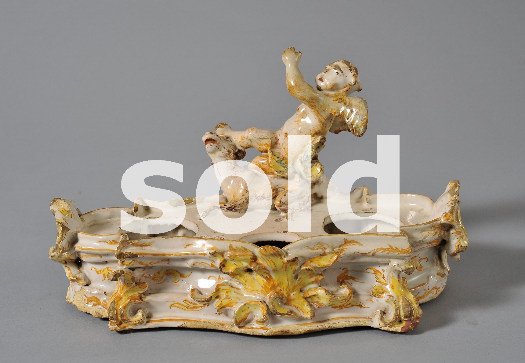 Elegant barocchetto maiolica inkwell crafted in Savona around the mid-18th century. Shaped as a miniature fountain, it features a raised figure of an angel interacting with a dog, both enriched with gilt floral decoration. The finely worked maiolica displays delicate, luminous colours, with shades of yellow and gold enhancing the piece’s beauty and refinement. Beyond its daily utility, the inkwell served as a symbol of luxury and prestige for the noble families who used it.