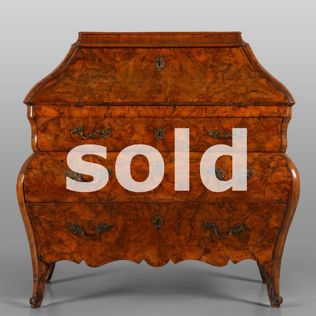 A Louis XV burr walnut veneered, featuring a shaped front and sides fall-front desk, Lombardy early 18th century.
