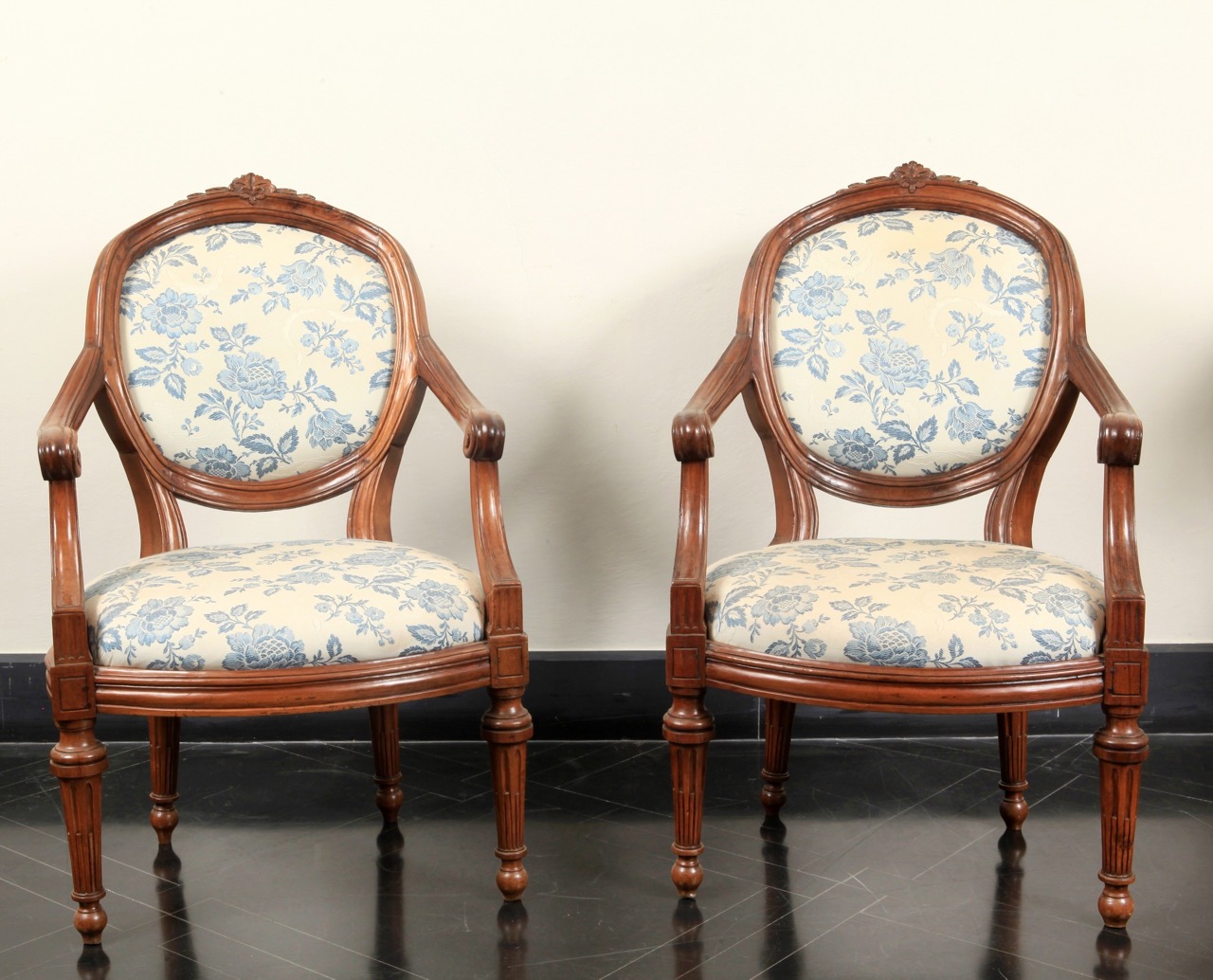 Two of eight Louis XVI walnut armchairs with oval backrest topped, Genoa, second half of the 18th century