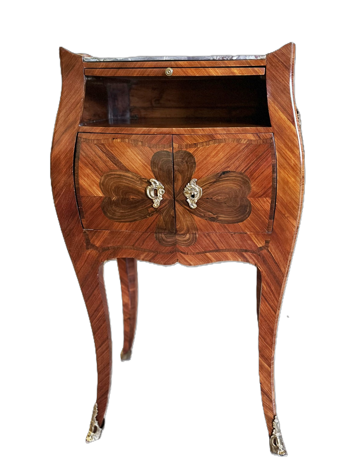 The case includes a cupboard compartment with doors and a small side drawer. Beneath the top is a discreet pull-out slide, suitable as a writing or serving surface. The piece is finished with a fior di pesco marble top and gilt-bronze fittings (handles and sabots), which accent the profile.