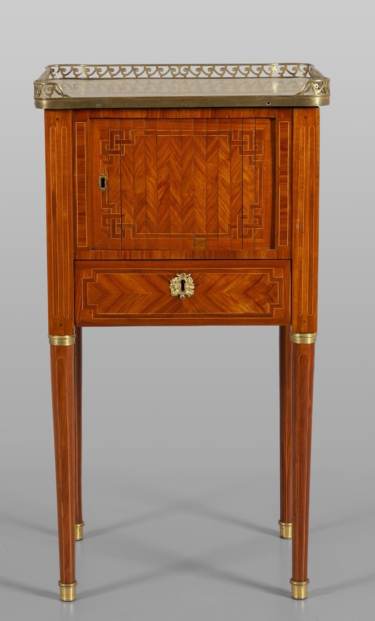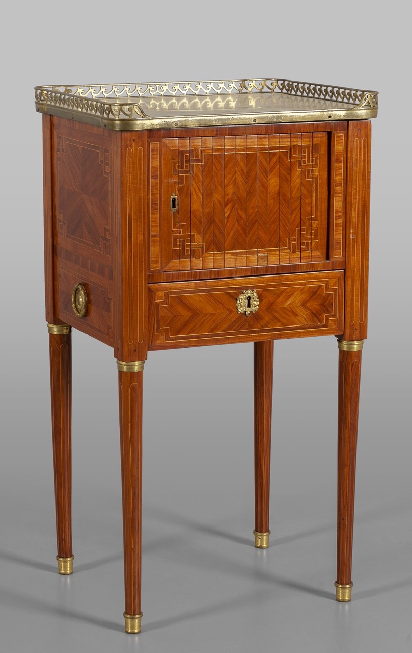 Tall round legs, front with rolling shutter, marble top with pierced bronze gallery.