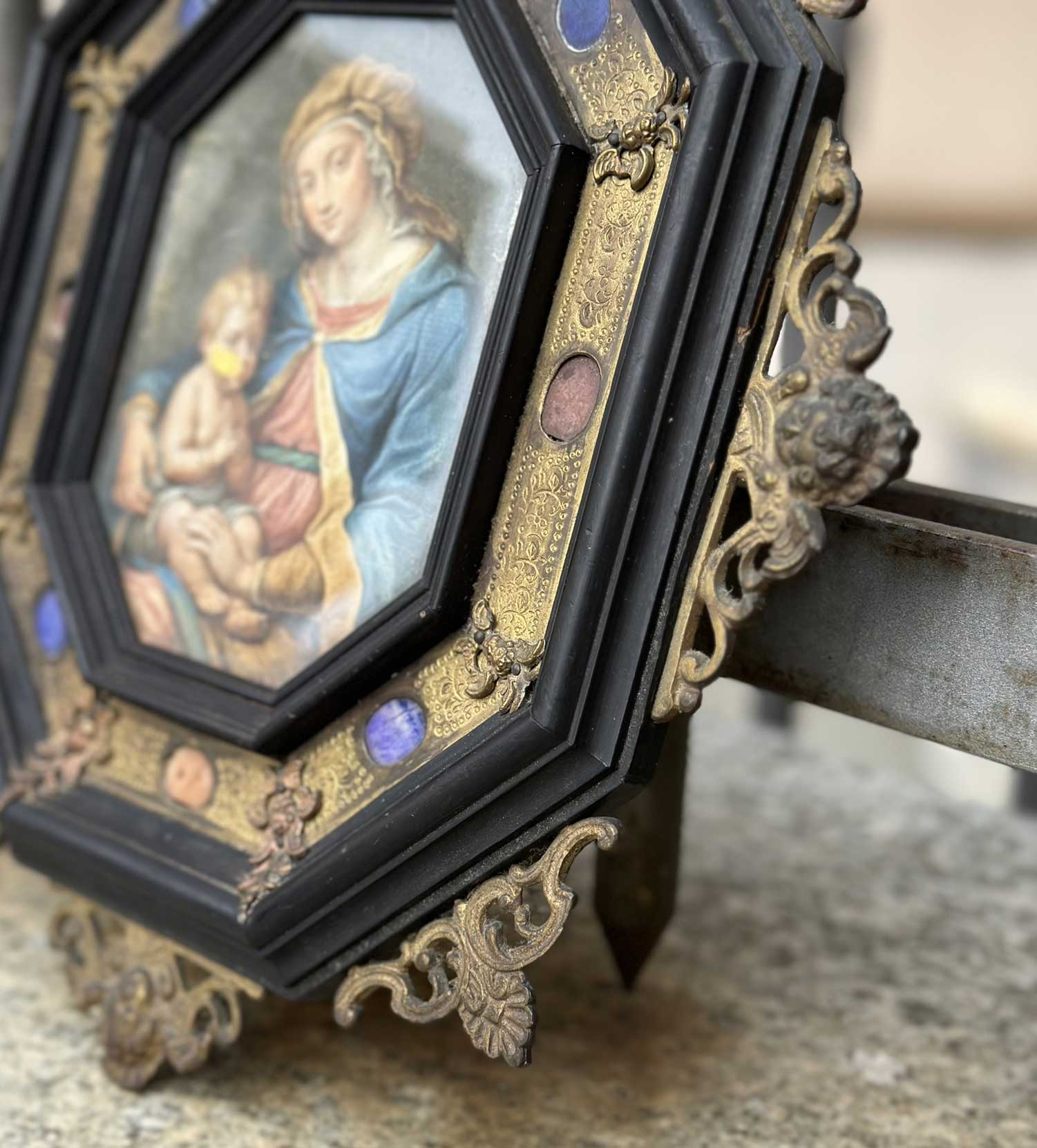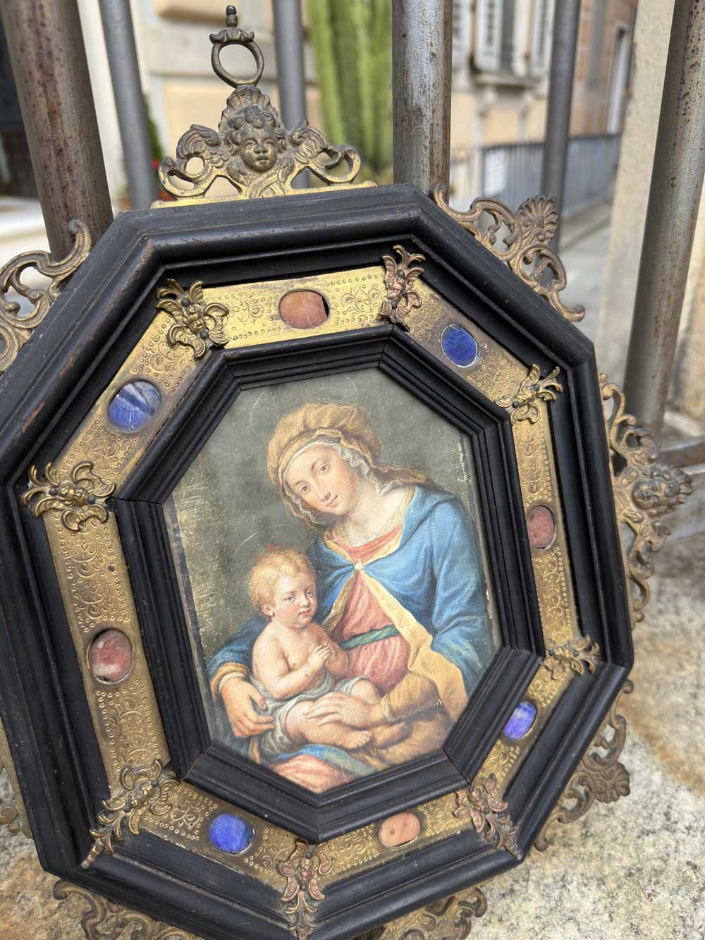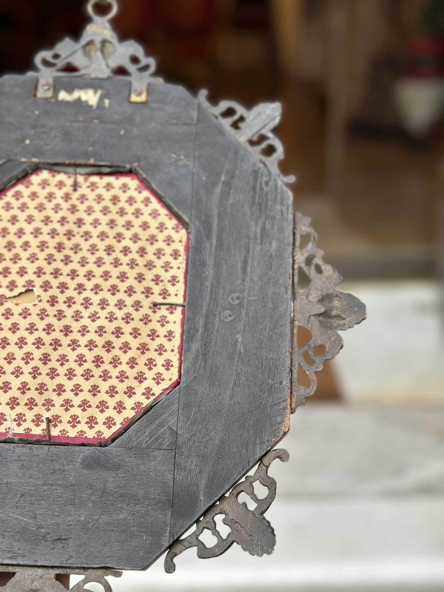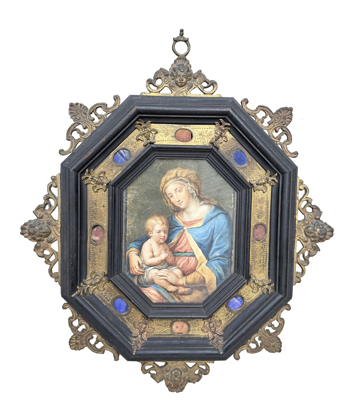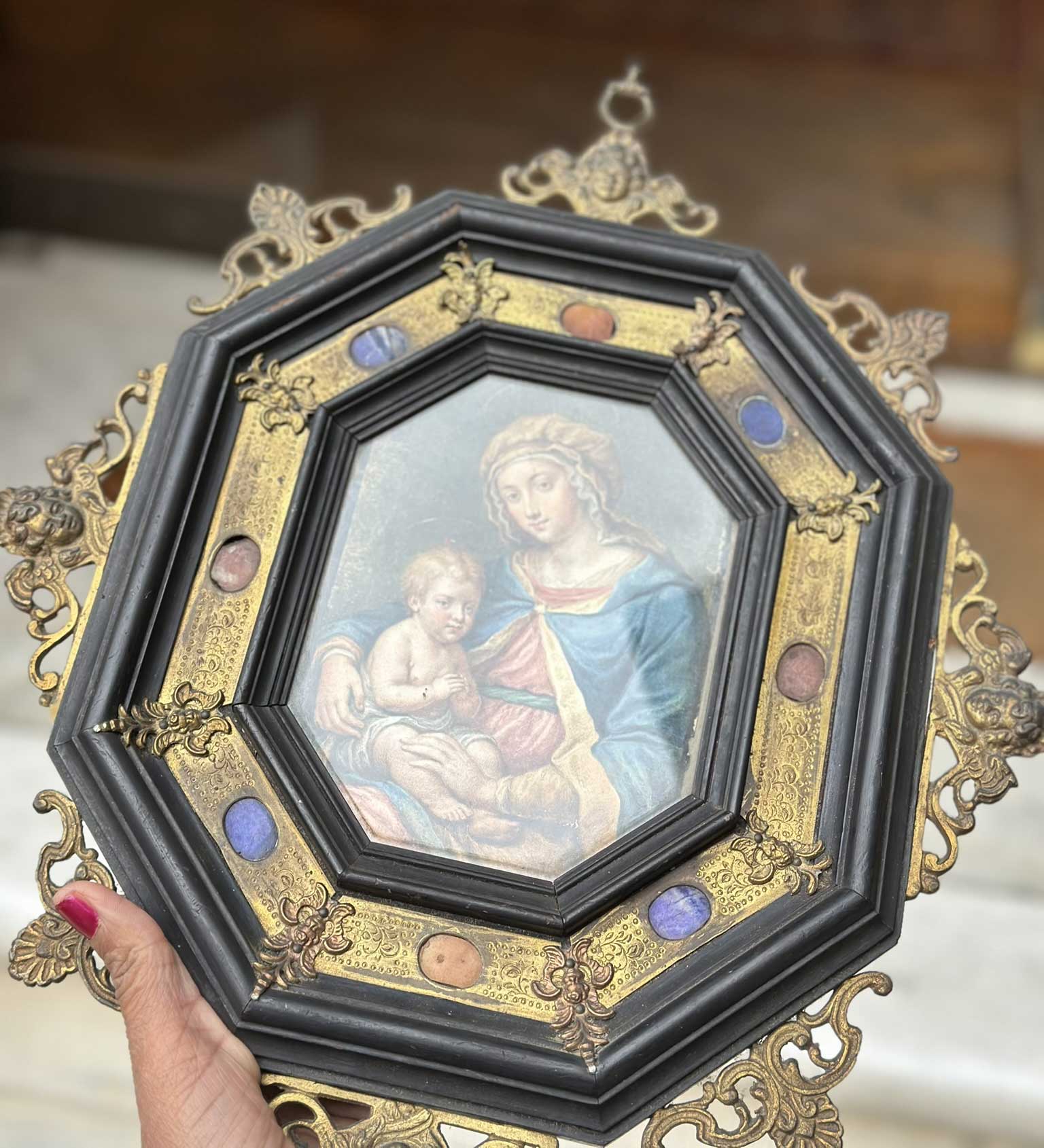 Raffinata cornice barocca ottagonale in legno ebanizzato, rame sbalzato e pietre dure del XIX secolo