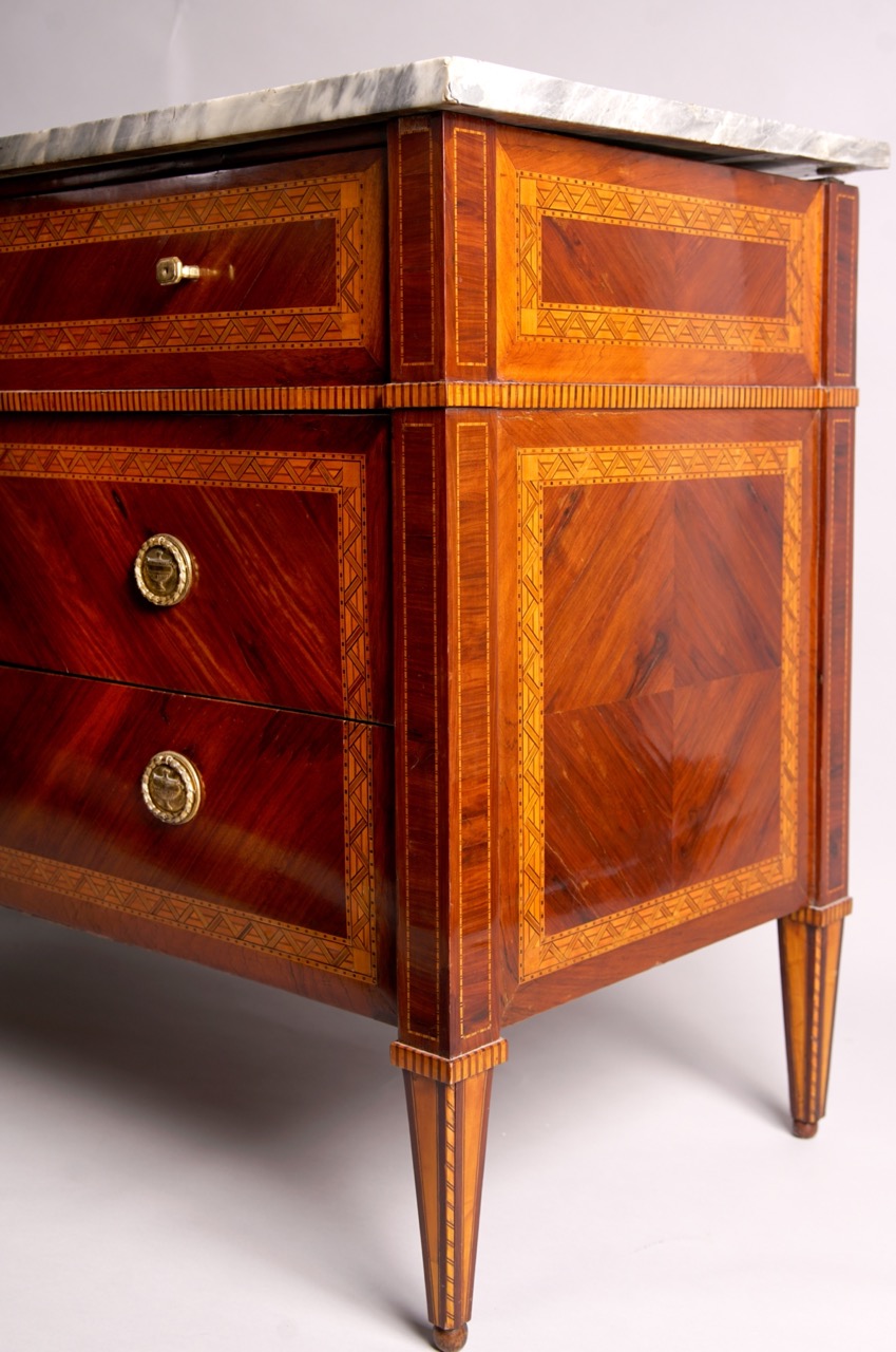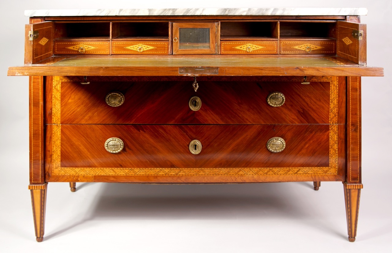 The central drawer conceals a hidden writing surface, a characteristic feature of multifunctional furniture from the period.