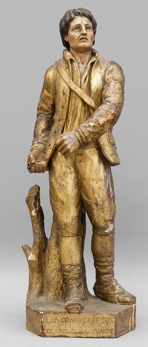 Cacciatore, scultura in legno intagliato e dorato con dededica nella base, secolo XVIII