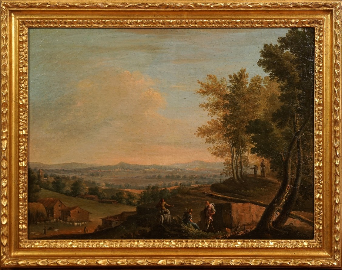 Paesaggi, coppia di dipinti raffiguranti di diversa ambientazione ma ugualmente armoniosi, scuola Piemontese secolo XVIII