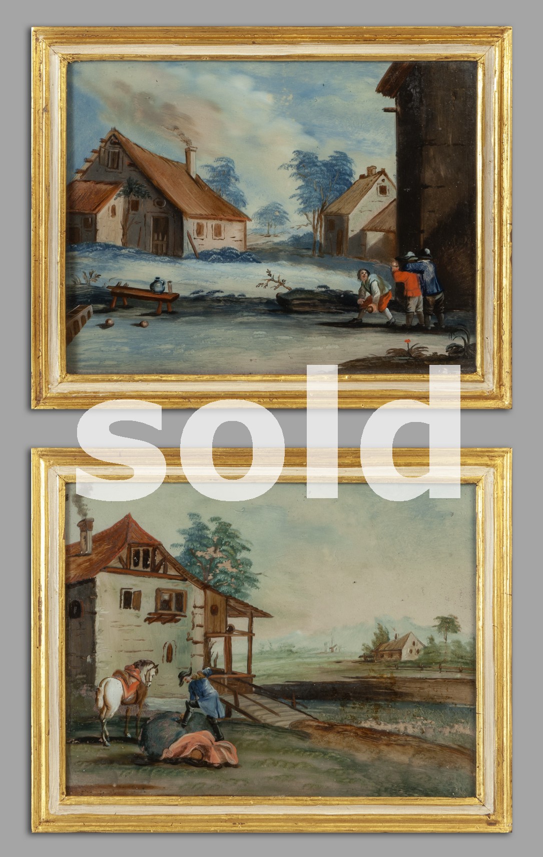 Paesaggi con personaggi, scuola veneta secolo XVIII, coppia di olii su vetro