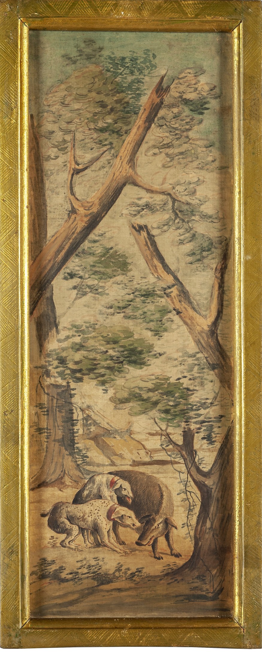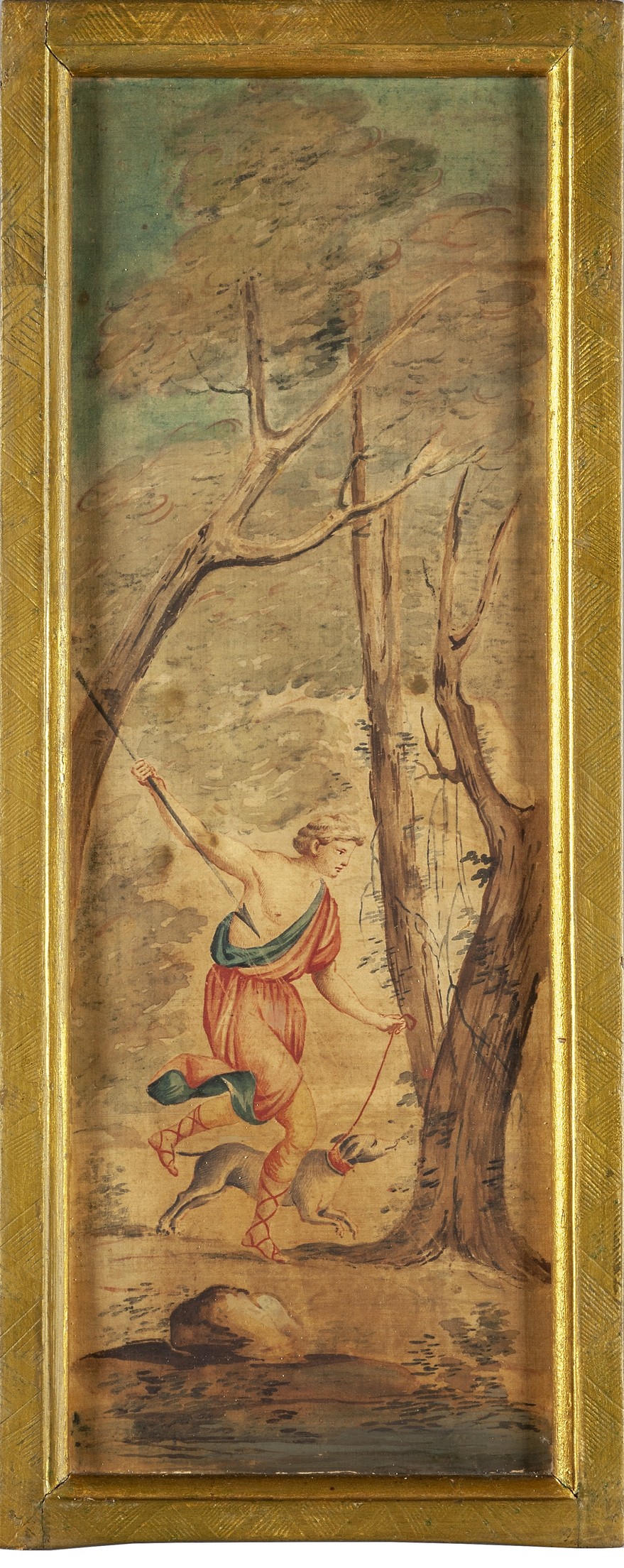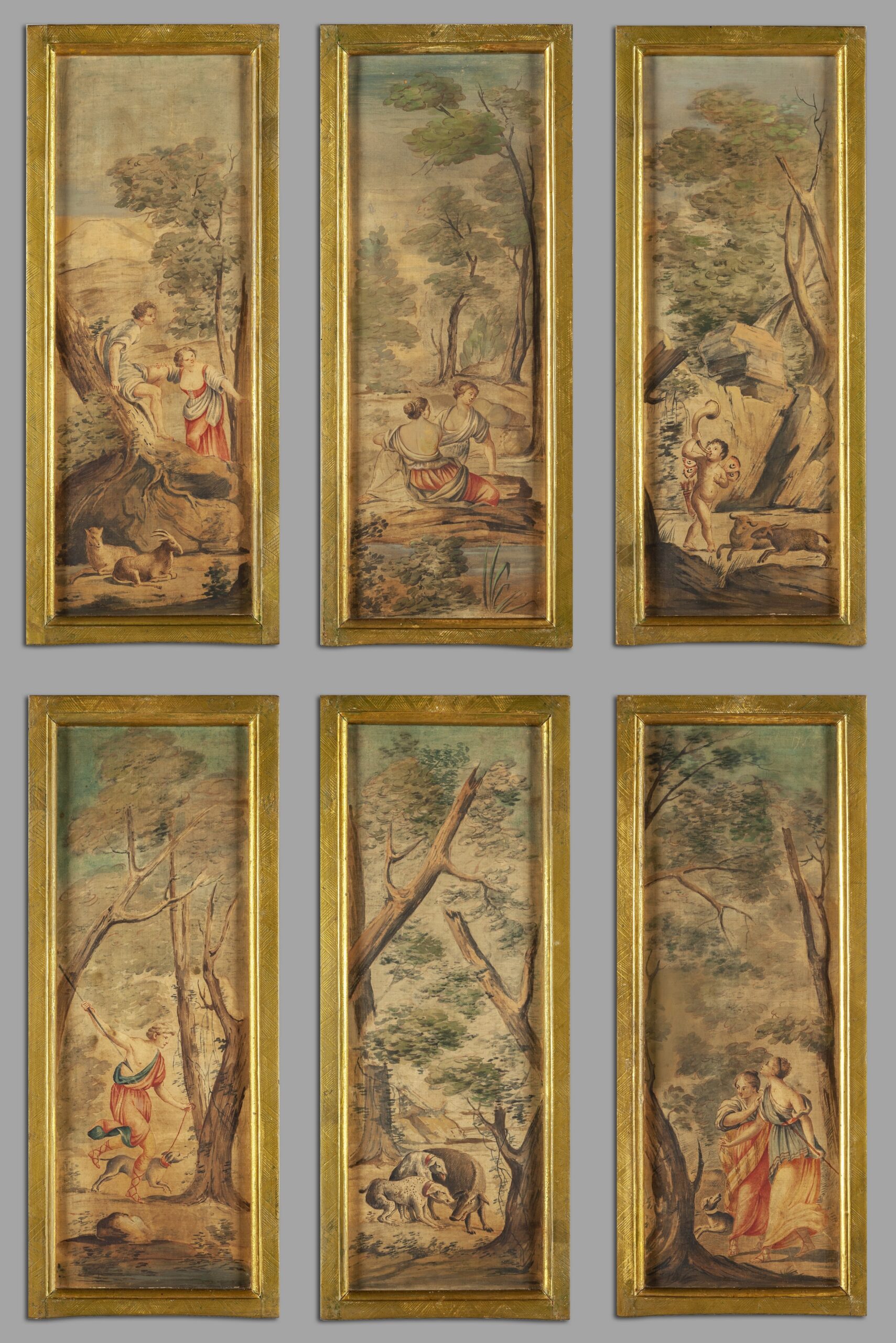 Sei acquarelli su seta raffiguranti personaggi e scene ispirate alla caccia in cornici in legno dorato, scuola lombarda fine secolo XVIII inizi secolo XIX
