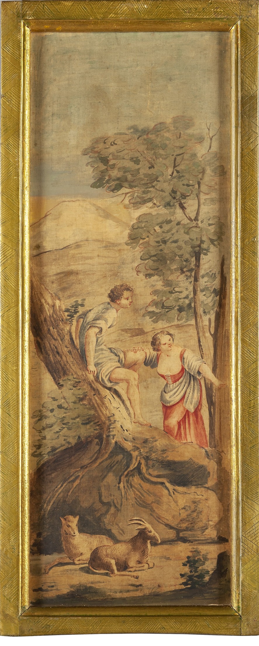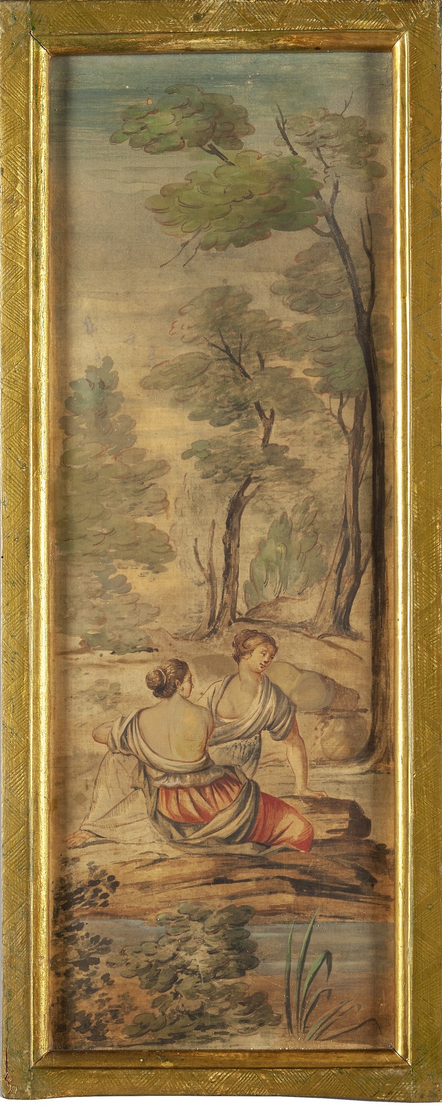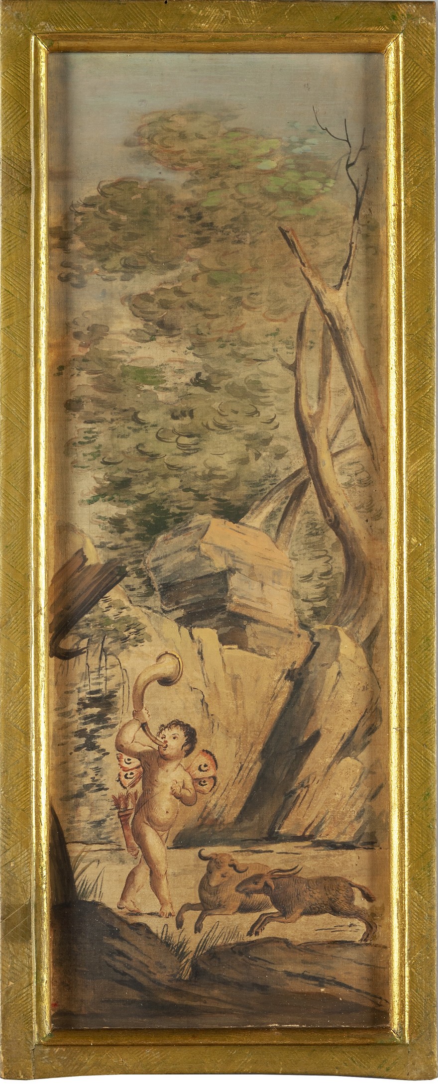 Sei acquarelli su seta raffiguranti personaggi e scene ispirate alla caccia in cornici in legno dorato, scuola lombarda fine secolo XVIII inizi secolo XIX