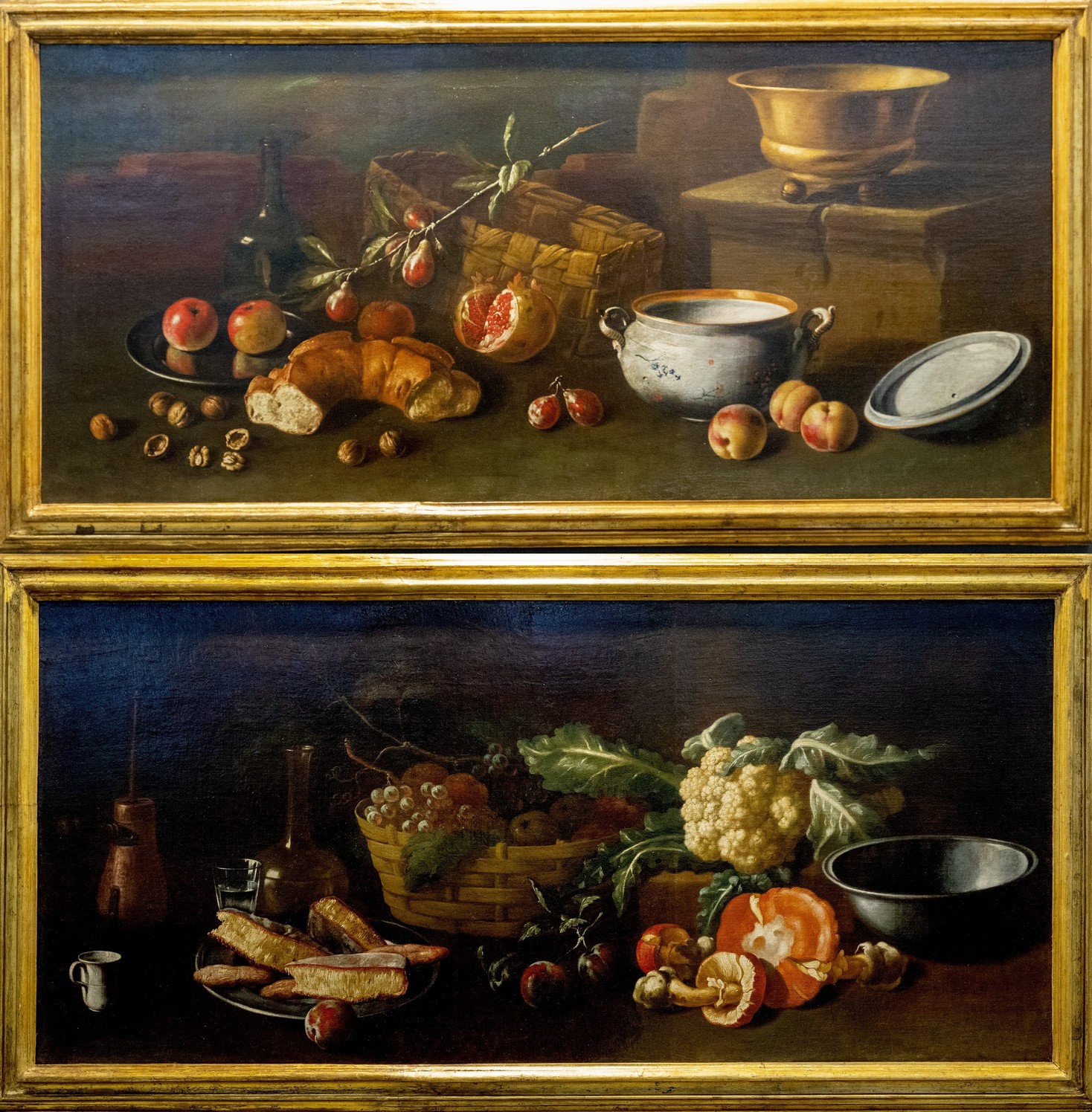 In questa coppia di dipinti si ripresenta la disposizione apparentemente arbitrale delle nature morte di Carlo Magini di oggetti da cucina di uso quotidiano e semplici vivande. Dopo le analisi del Longhi negli anni cinquanta del novecento, il pittore viene considerato uno dei maggiori naturalisti del settecento. In tutte le sue opere la collocazione degli oggetti e delle vivande è attenta e raffinata, in modo da sottolineare contemporaneamente sia la diversità delle superfici e dei materiali che il gioco delle forme. Nelle opere del Magni la luce è chiara e forte così da delimitare nettamente gli oggetti, ma al contempo mai troppo intensa da far loro perdere la tridimensionalità.