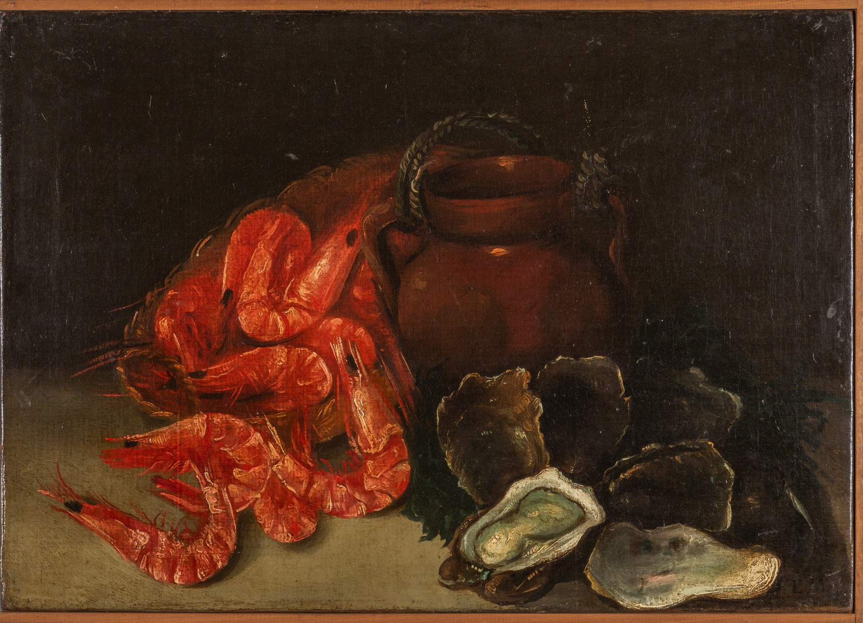 Natura morta con gamberi e ostriche, olio Scuola fiamminga secolo XVII, monogramma LM