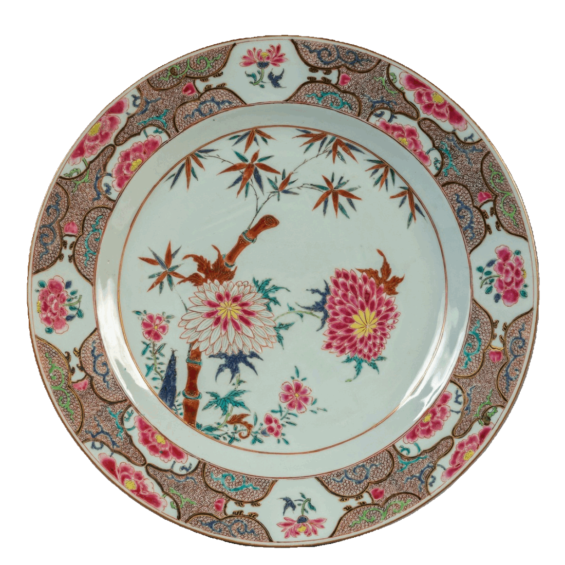 A large porcelain Famille Rose dish, decorated with peonies and bamboo, China, 18th century