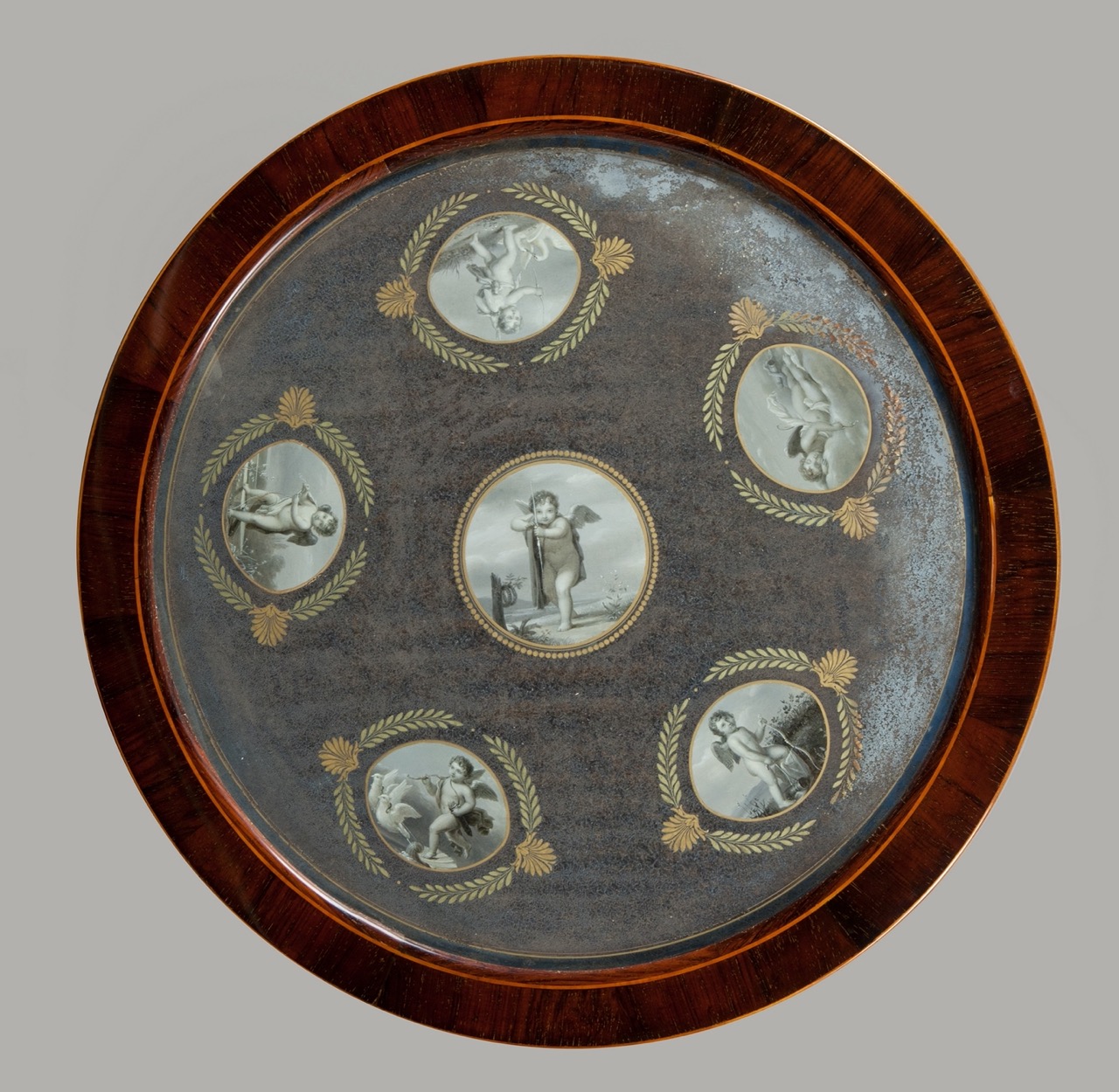 Veneered in mahogany and edged with amaranth, the top is adorned with six medallions painted with putti in grisaille.