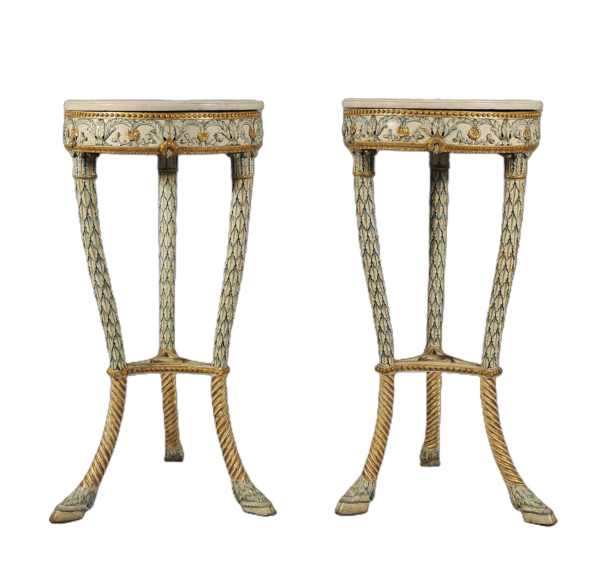 Coppia di importanti guéridon in legno scolpito dorato e policromato, Napoli fine secolo XVIII