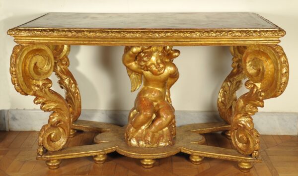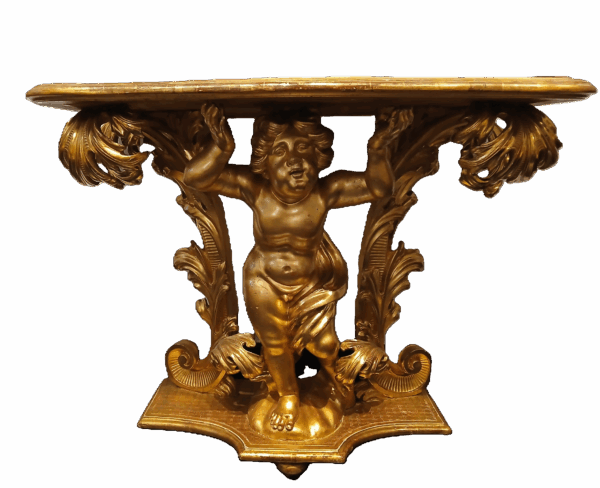 Consolle Luigi XIV in legno intagliato e dorato con putto reggipiano, Roma secolo XVIII
