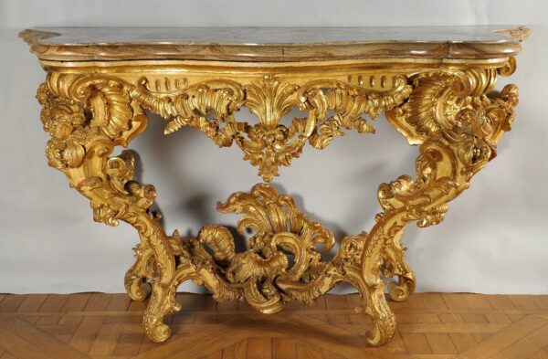 Consolle Luigi XV in legno finemente intagliato e dorato piano in marmo bardiglio, Genova metà secolo XVIII