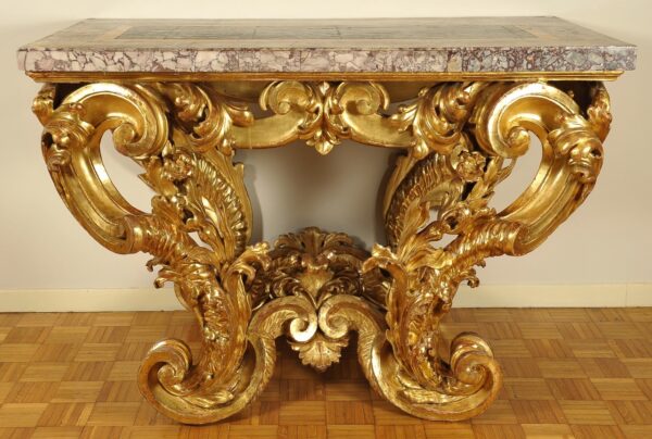 Importante consolle barocca in legno intagliato e dorato a motivo di volute ed elementi floreali, Roma inizi secolo XVIII