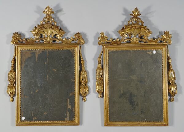 Coppia di specchiere Luigi XV in legno riccamente intagliato e dorato, Italia meridionale prima metà secolo XVIII