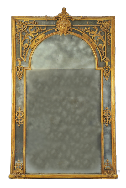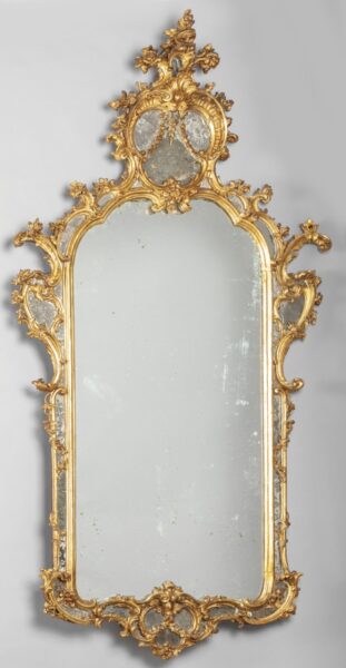 Grande specchiera Luigi XV in legno finemente intagliato e dorato con controspecchi, Piemonte prima metà secolo XVIII