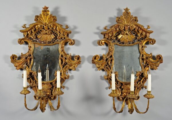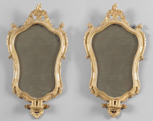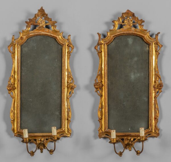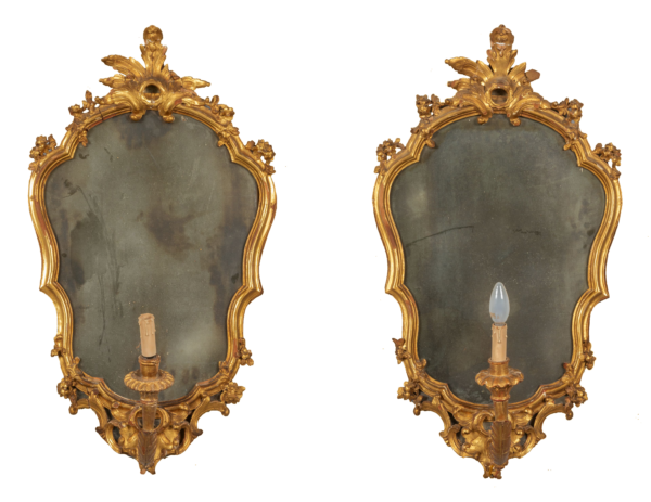 Coppia di specchiere Luigi XV in legno finemente intagliato e dorato con bracci portaluce e specchi antichi, Lombardia metà secolo XVIII
