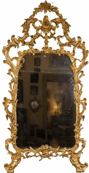 Specchiera Luigi XV in legno finemente intagliato e dorato a motivo di pellacce, Genova metà secolo XVIII