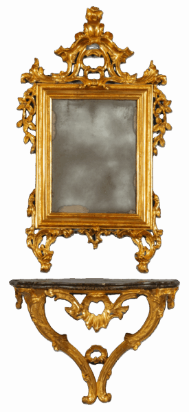 Console d’appoggio con specchiera pertinente in legno finemente intagliato e policromato, Novara, fine XVIII secolo