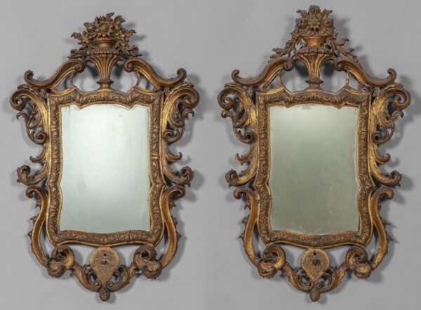 Coppia di specchiere Luigi XV in legno intagliato e dorato a motivo di pellacce e tralci fioriti, Genova metà secolo XVIII
