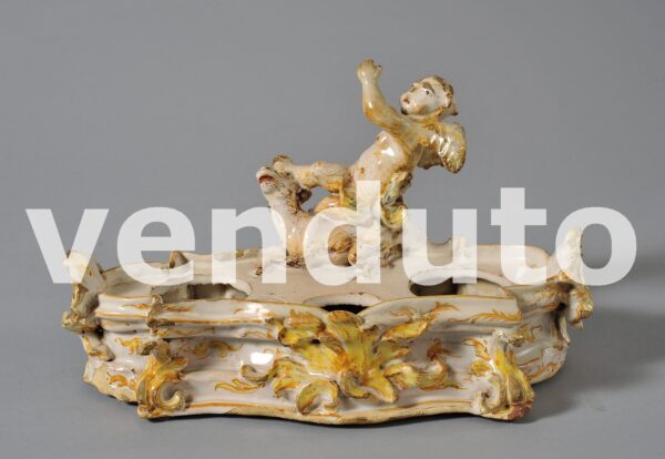 Calamaio barocchetto in maiolica di Savona a guisa di fontana, metà secolo XVIII