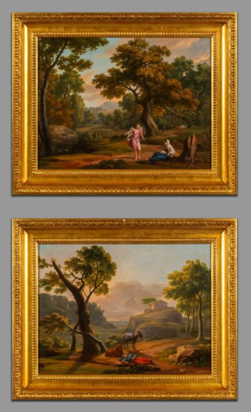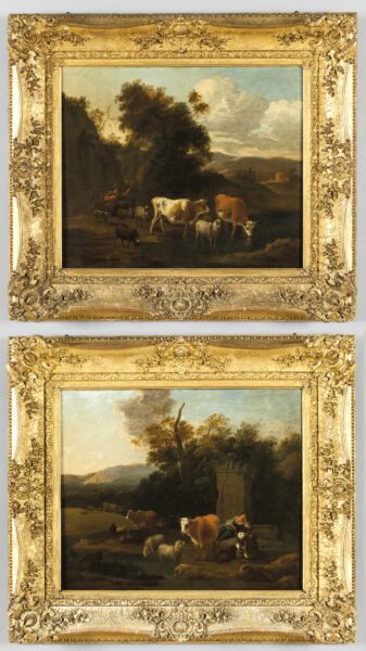 Paesaggi con armenti e contadini, coppia di oli in cornice intagliata e dorata, scuola romana secolo XVIII
