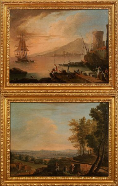 Paesaggi, coppia di dipinti raffiguranti di diversa ambientazione ma ugualmente armoniosi, scuola Piemontese secolo XVIII