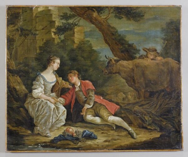 Scena romantica, olio su tela, scuola francese secolo XVIII