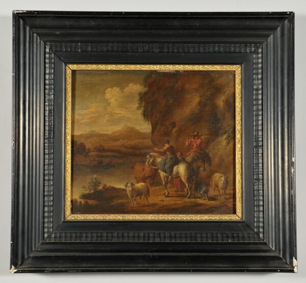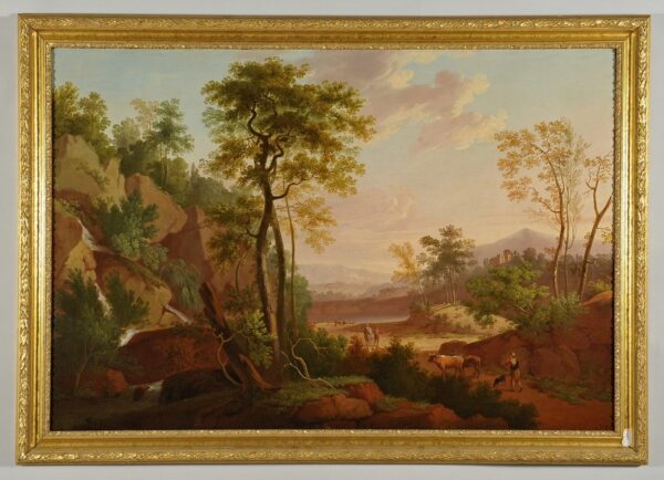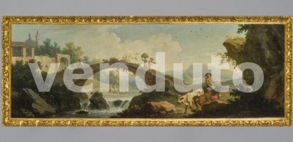 Paesaggio con armenti e viandanti, scuola italiana secolo XVIII, olio su tela in cornice intagliata e dorata