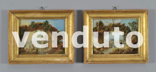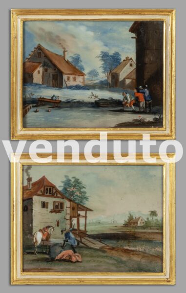 Paesaggi con personaggi, scuola veneta secolo XVIII, coppia di olii su vetro