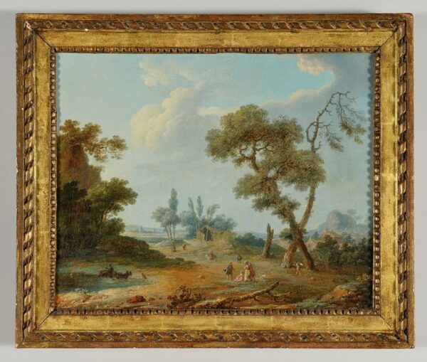Viandanti in un paesaggio, olio su tela in cornice intagliata e dorata, scuola francese seconda metà secolo XVIII