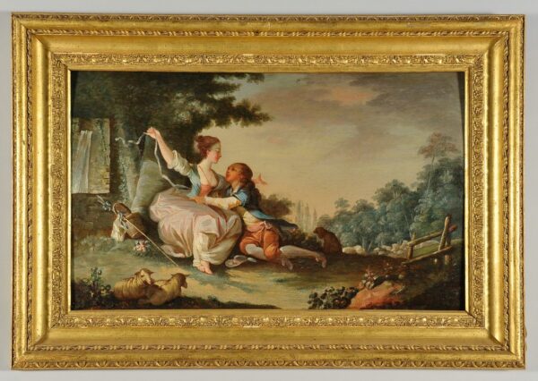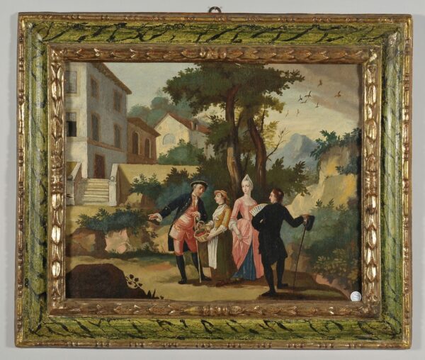 Scena romantica, olio su tavola in cornice intagliata e dorata, Francia fine secolo XVIII