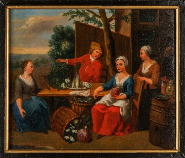 Scena conviviale, scuola fiamminga secolo XVIII, olio su tavola
