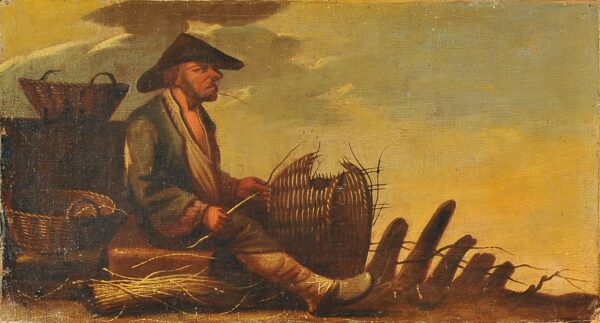 Riparando il cesto al tramonto, olio su tela, scuola italiana secolo XVIII