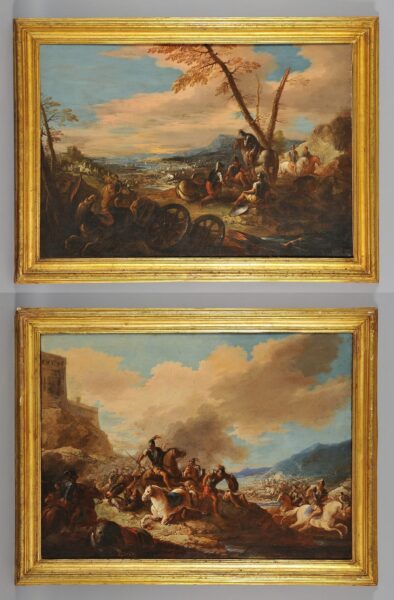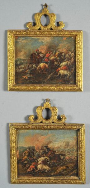 Joseph Parrocel detto ‘Parrocel des Batailles’ (Brignoles 1646 Parigi 1704) coppia di oli su tela in cornice dorata di epoca