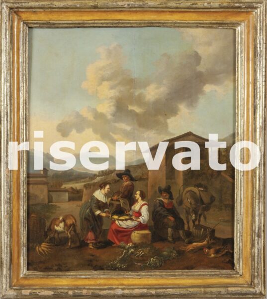 Paesaggio animato con figure, olio. Scuola italiana secolo XVII in splendida cornice coeva