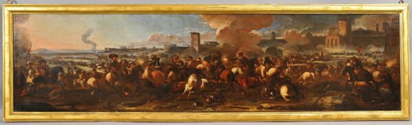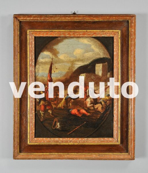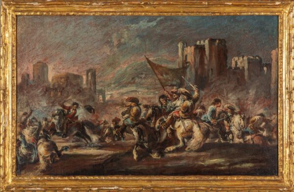 Francesco Simonini (Parma 1686 Firenze 1753) Battaglia tra cavalieri, olio su tela in cornice coeva in legno intagliato e dorato