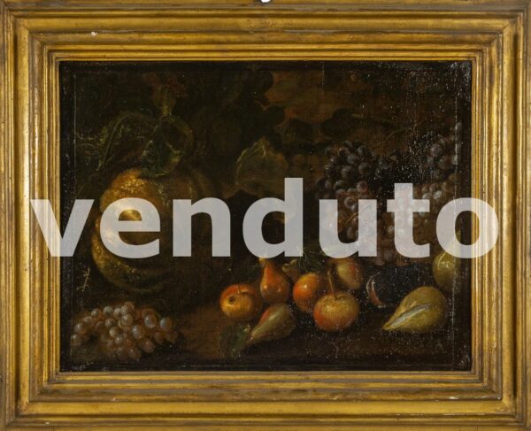 Natura morta con melone uva e fichi, olio su tela, scuola romana secolo XVII