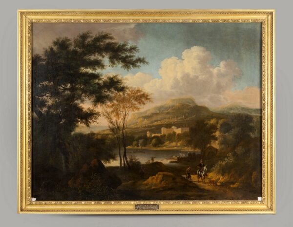 Frederick de Moucheron (Emden 1633 Amsterdam 1686) Paesaggio con viandanti all’imbrunire, olio su tela